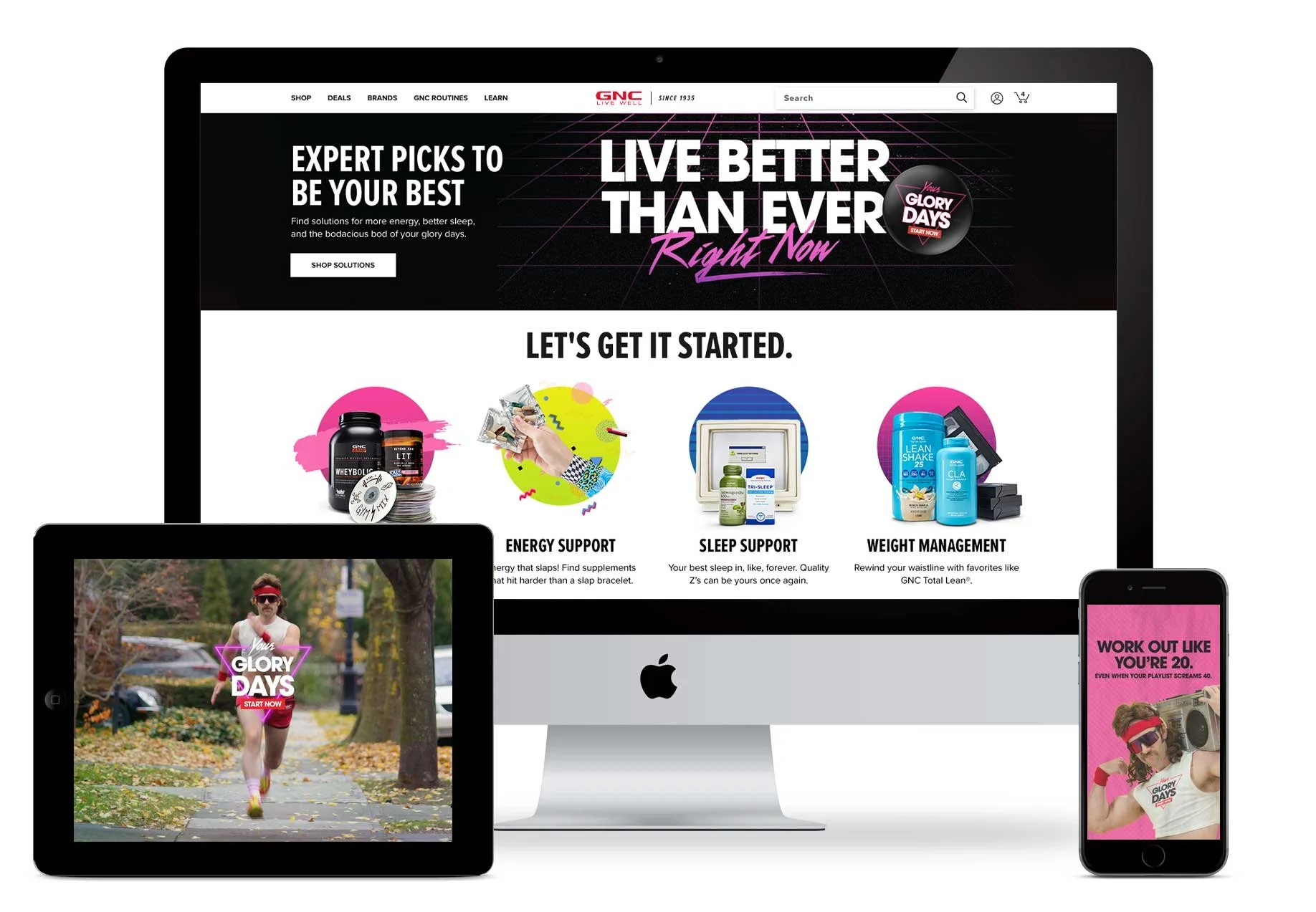 The Glory Days campaign was a massive omni-channel initiative that started off the new year for GNC’s 35+ demographic. Focusing on key themes and culturally iconic moments from the 80’s and 90’s, we produced a nostalgic time capsule that gave our audience a jolt of retro fun to kick off their January. Witty headlines worked as reminders of things long forgotten, and paired with the vivid neon aesthetic and wardrobe that would make the Saved by the Bell crew proud. The end result was an attention-grabbing campaign that stood out against the common “New Year, New You” themes and reminded our customers that it’s never too late to recapture the glory days of their youth.